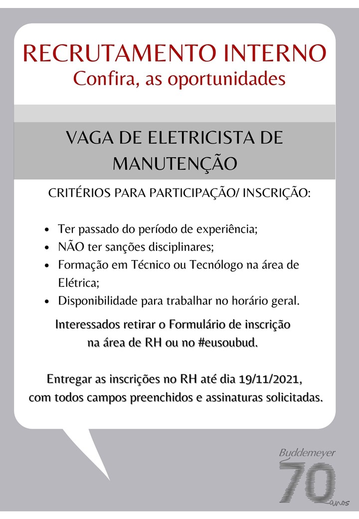 Recursos Humanos • nov 12 • 14:44 RECRUTAMENTO INTERNO- ELETRICISTA DE MANUTENÇÃO. Clique no link e baixe a sua ficha de inscrição. Recrutamento Interno 2019.xls
