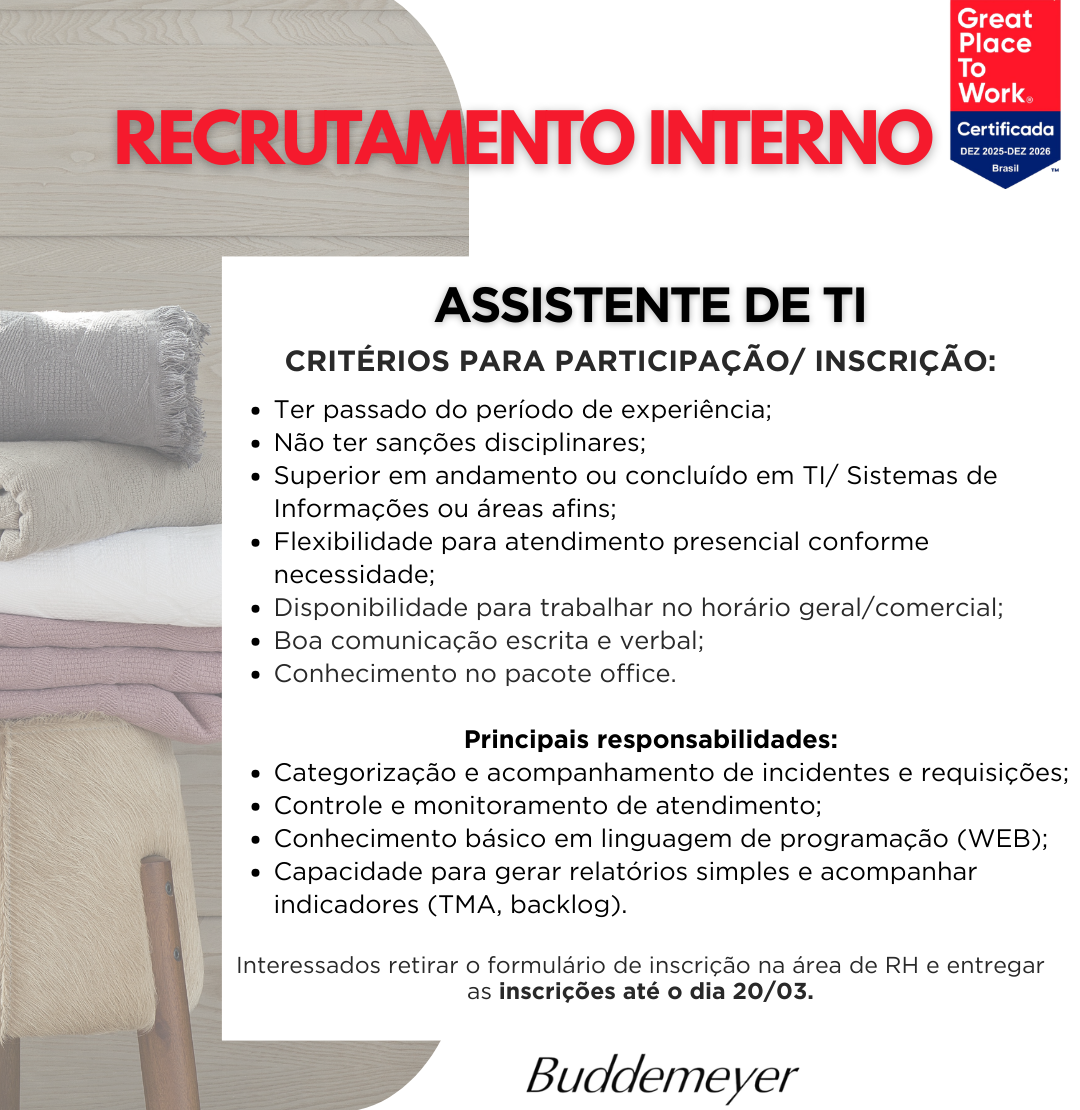 Recursos Humanos • mar 12 • 13:49 Recrutamento interno – TI Se você busca crescer na área de tecnologia essa pode ser a chance que você estava esperando! 💻 Confira todos os detalhes: