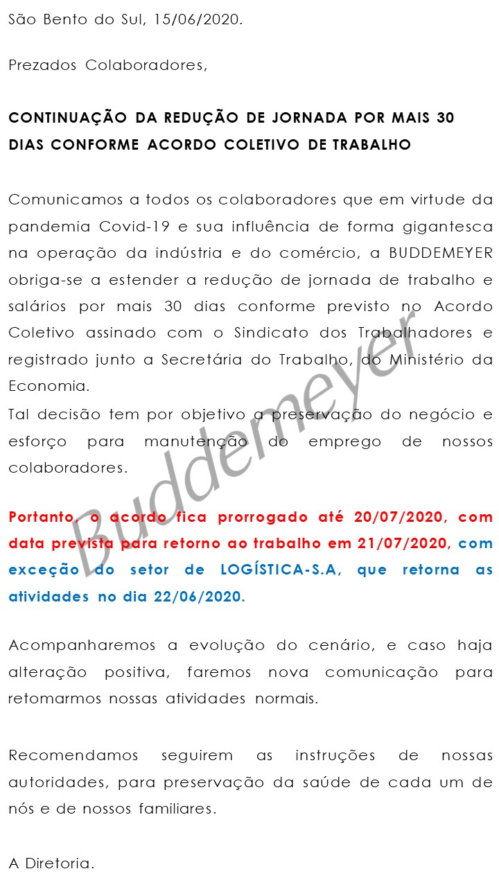 Colaborador, clique aqui e confira a decisão para os próximos 30 dias em relação a redução de jornada e salários na Buddemeyer.
