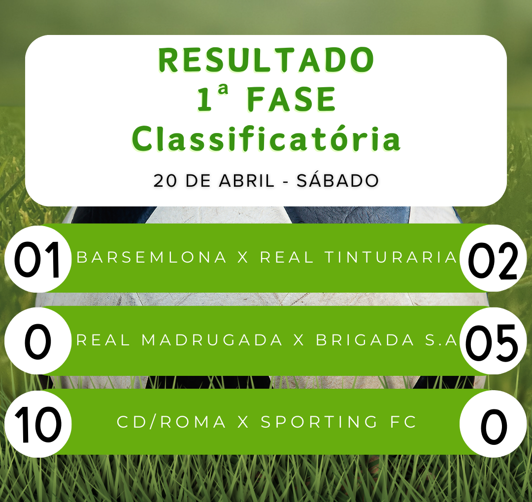 Recursos Humanos • abr 23 • 08:07 Resultado 1ª Fase – Torneio de Futebol Bud BARSEMLONA REAL TINTURARIA BRIGADA S.A REAL MADRUGADA CD ROMA SPORTING FC