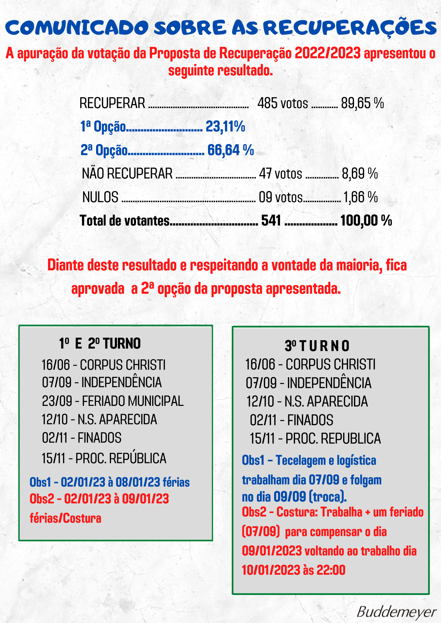 Recursos Humanos • jul 29 • 11:53 Resultado da assembleia que aprovou a recuperação de dias para o final do ano 2022 e início 2023. Clique aqui e confira o resultado da recuperação de 2022/2023.