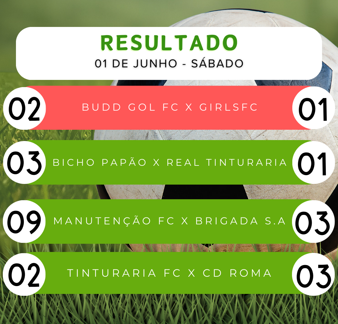 Recursos Humanos • jun 03 • 16:17 Resultados Jogos 01/06 – Torneio de Futebol Bud BUDD GOL FC GIRLS FC BICHO PAPÃO REAL TINTURARIA MANUTENÇÃO FC BRIGADA S.A TINTURARIA FC CD ROMA