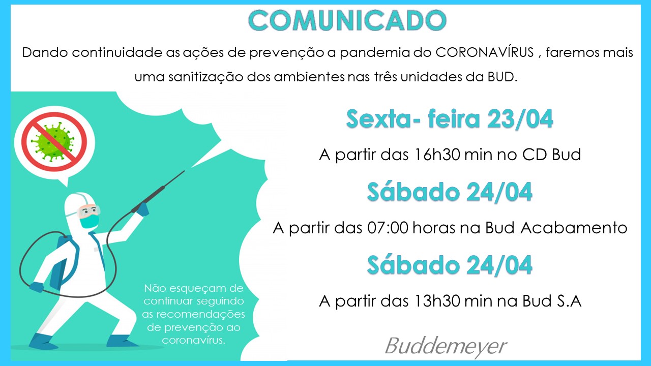 Recursos Humanos • abr 22 • 08:00 Sanitizações de abril Bud! Prevenção é a solução, clique e confira as próximas datas de sanitização na Bud!