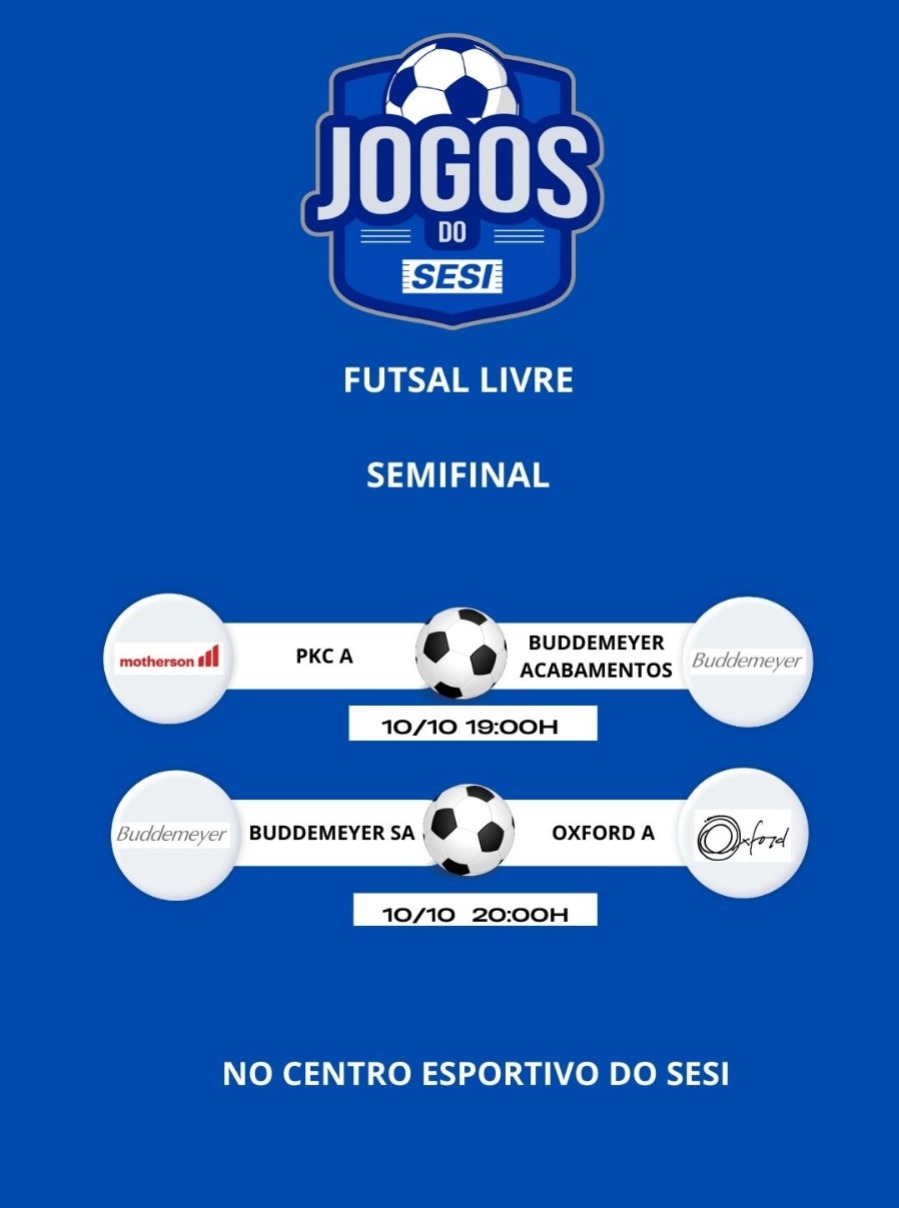 Recursos Humanos • out 10 • 09:09 SEMIFINAL DO SESIANO – FUTSAL LIVRE A BUD chegou a semifinal dos jogos do SESI e hoje é dia de decisão, confira a programação. TIME BUDDEMEYER S.A TIME BUDDEMEYER ACABAMENTO TÊXTIL