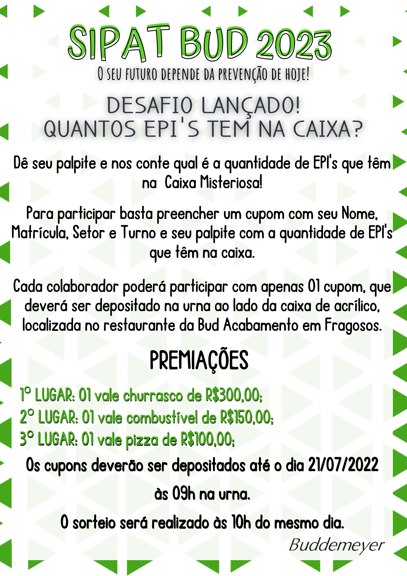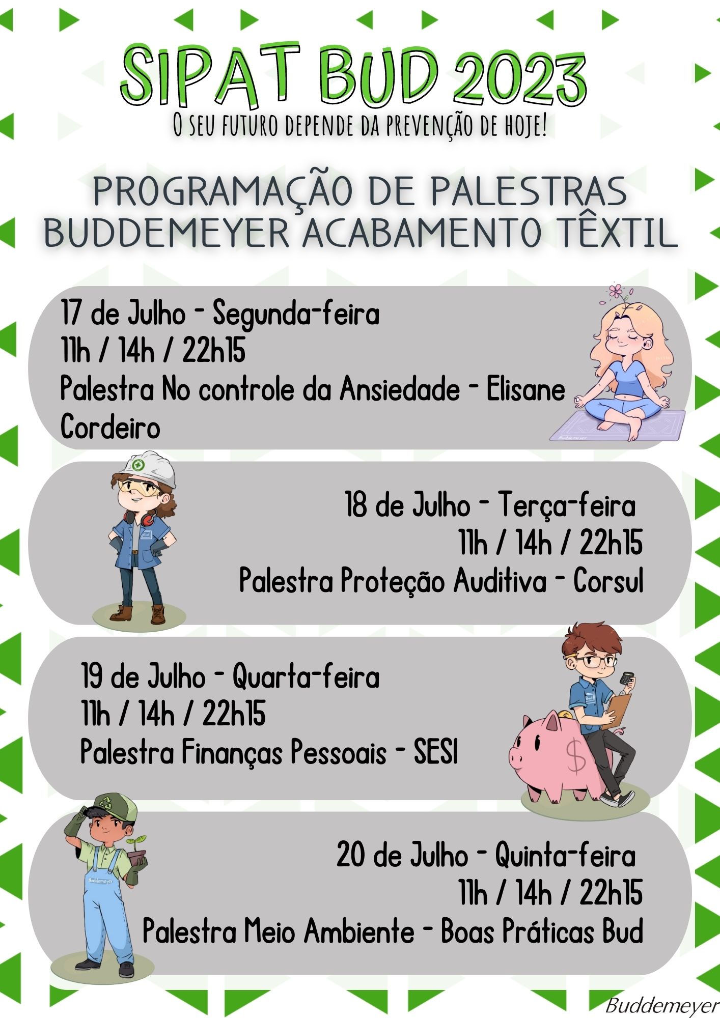Recursos Humanos • jul 13 • 08:46 SIPAT 2023 – Programação BUD Acabamento Não fique de fora da SIPAT da BUD Acabamento, confira a programação especial.