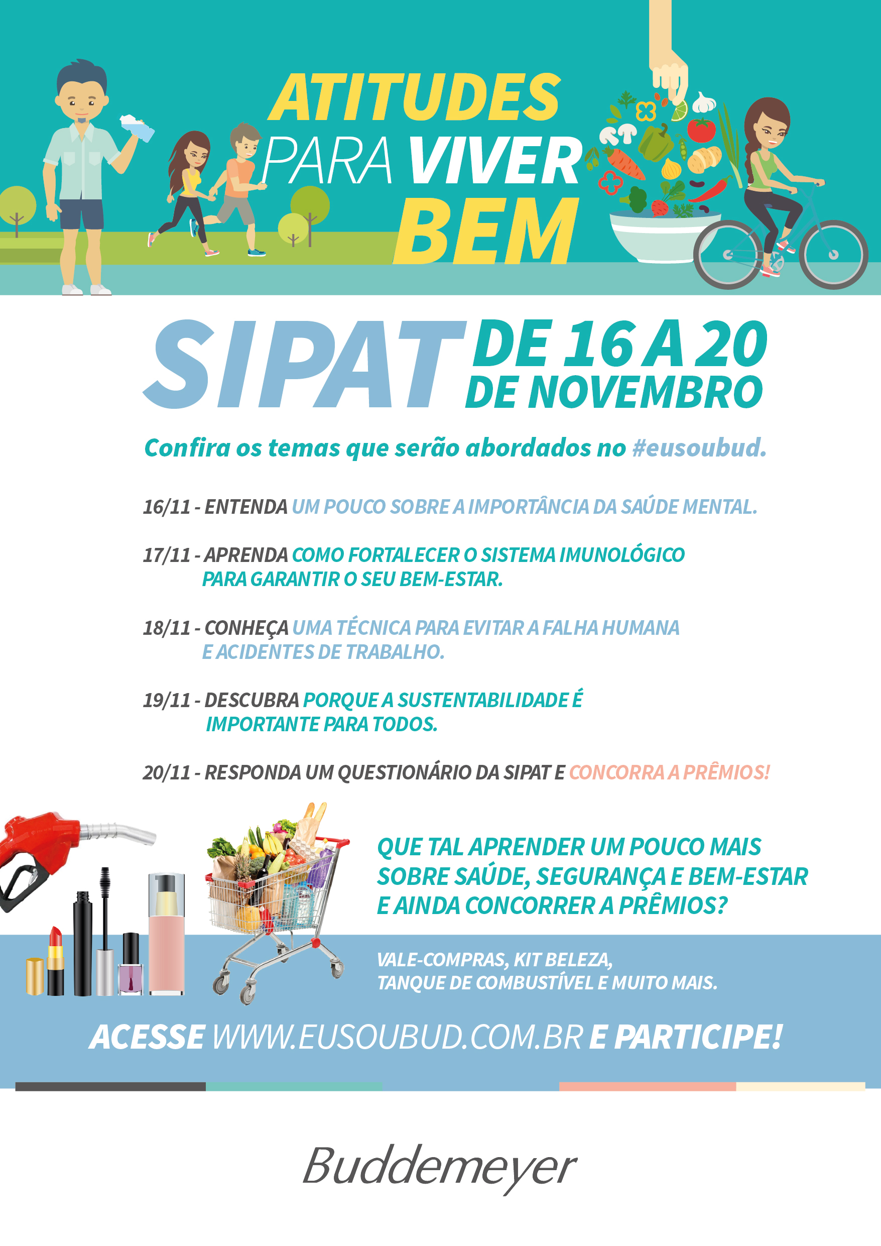 Recursos Humanos • nov 13 • 08:45 SIPAT Virtual na Buddemeyer Preparem-se para a próxima semana! Clique aqui e saiba tudo sobre a programação da SIPAT.