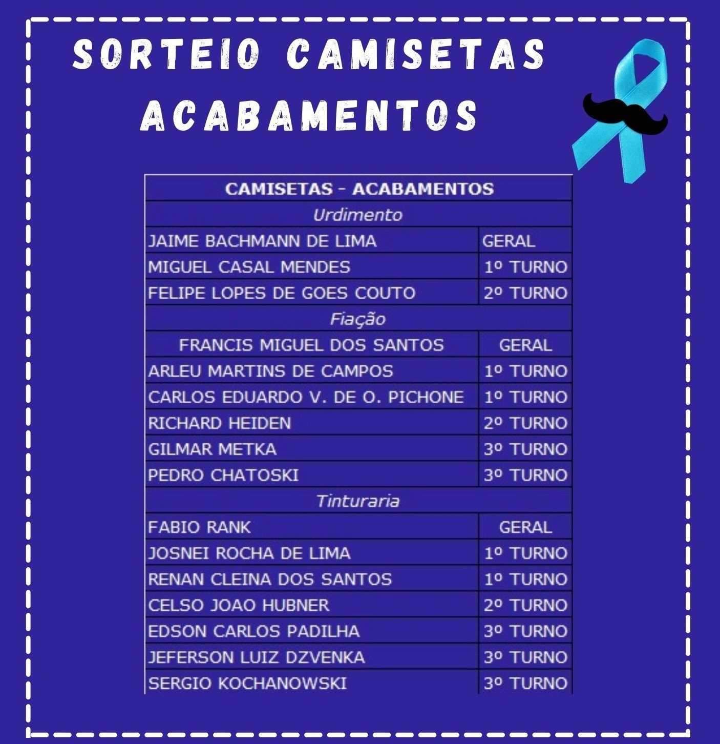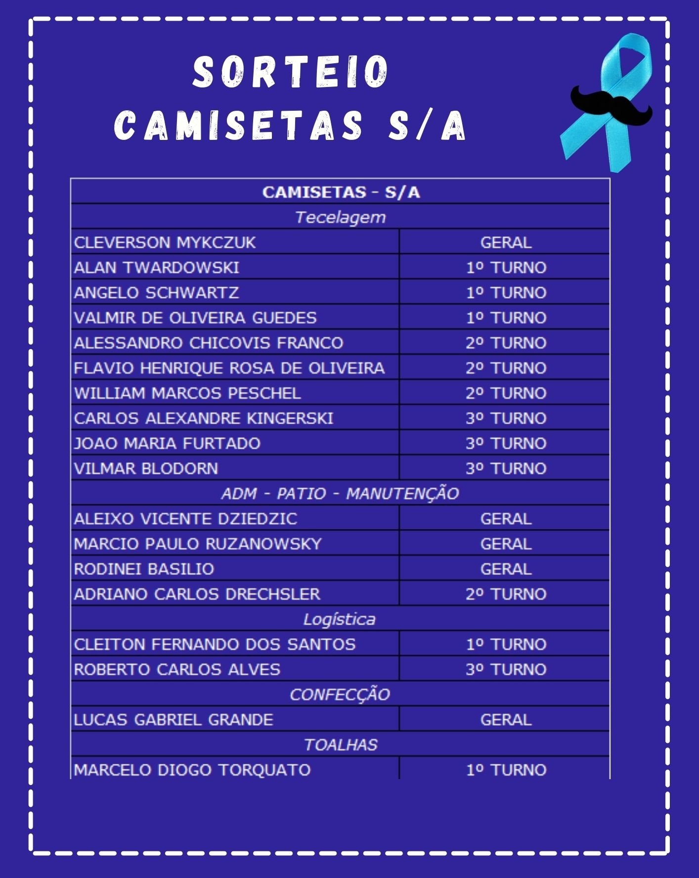 Quer saber quem foram os ganhadores do sorteio das camisetas da campanha Novembro Azul 2021? Clique aqui e confira! A retirada das camisetas para os sorteados do 1º e 2º turno, será a partir do dia 03/11, no ambulatório da SA e Acabamentos; A entrega do 3º turno será realizada pela chefia de cada setor. Para o setor administrativo a entrega será realizada em 03/11 no Bom Dia.