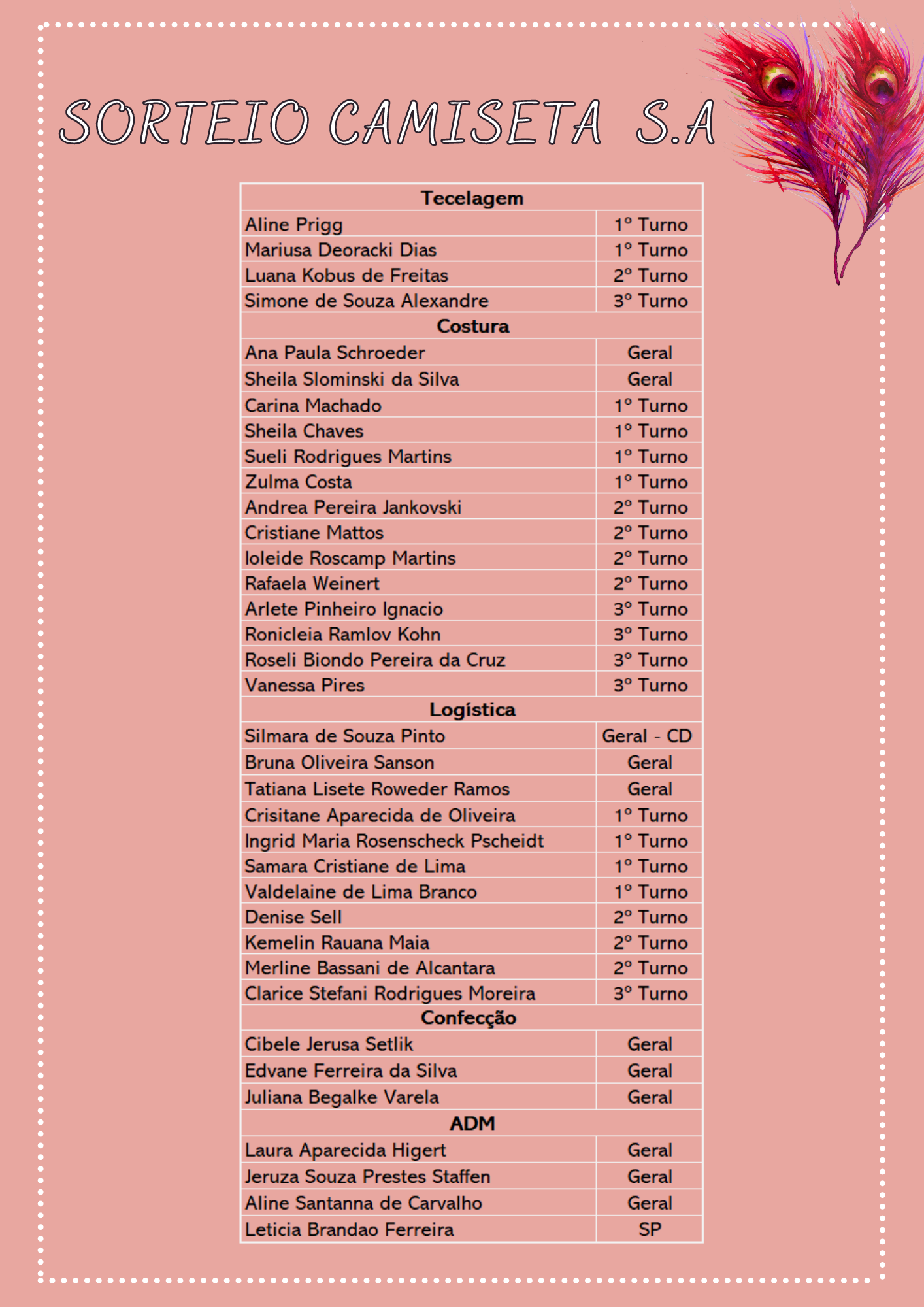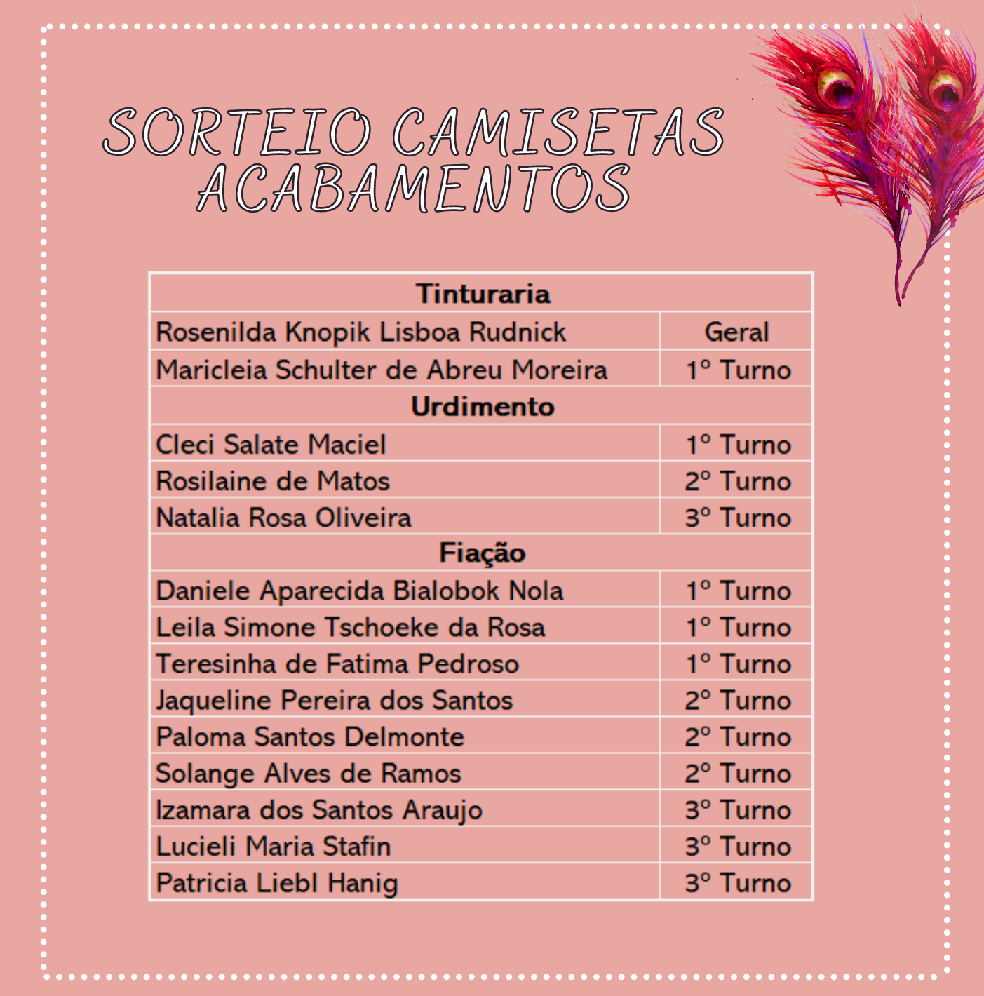 Recursos Humanos • out 03 • 13:43 Sorteio de Camisetas – Outubro Rosa 2022 Quer saber quem foram as contempladas com as camisetas da Campanha Outubro Rosa 2022? Clique no link e confira! A entrega das camisetas será realizada pela chefia de cada setor.