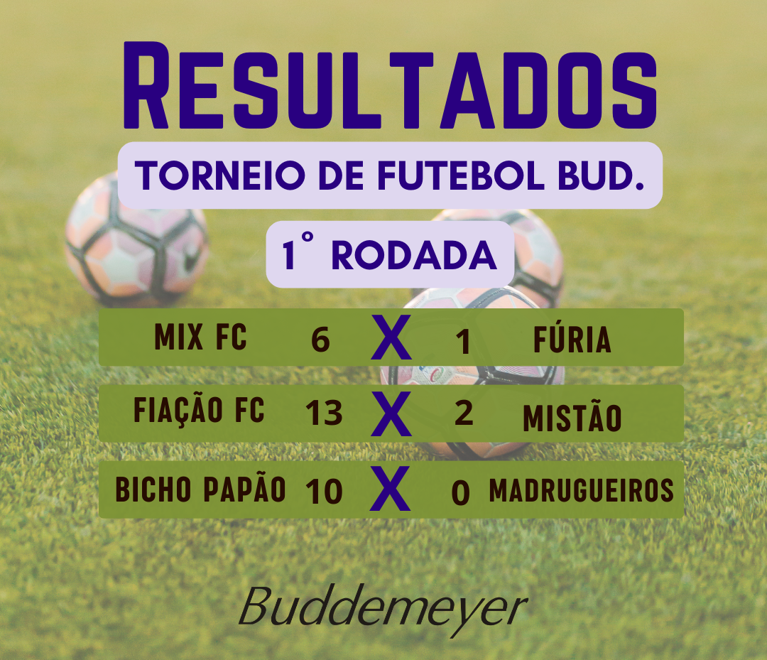 Recursos Humanos • maio 22 • 16:47 Torneio de Futebol Bud. No último sábado, dia 20 de maio, aconteceu a 1º rodada do torneio interno de futebol da Bud. Confira os resultados dos jogos e alguns registros. MIX FC FÚRIA FIAÇÃO FC MISTÃO BICHO PAPÃO MADRUGUEIROS