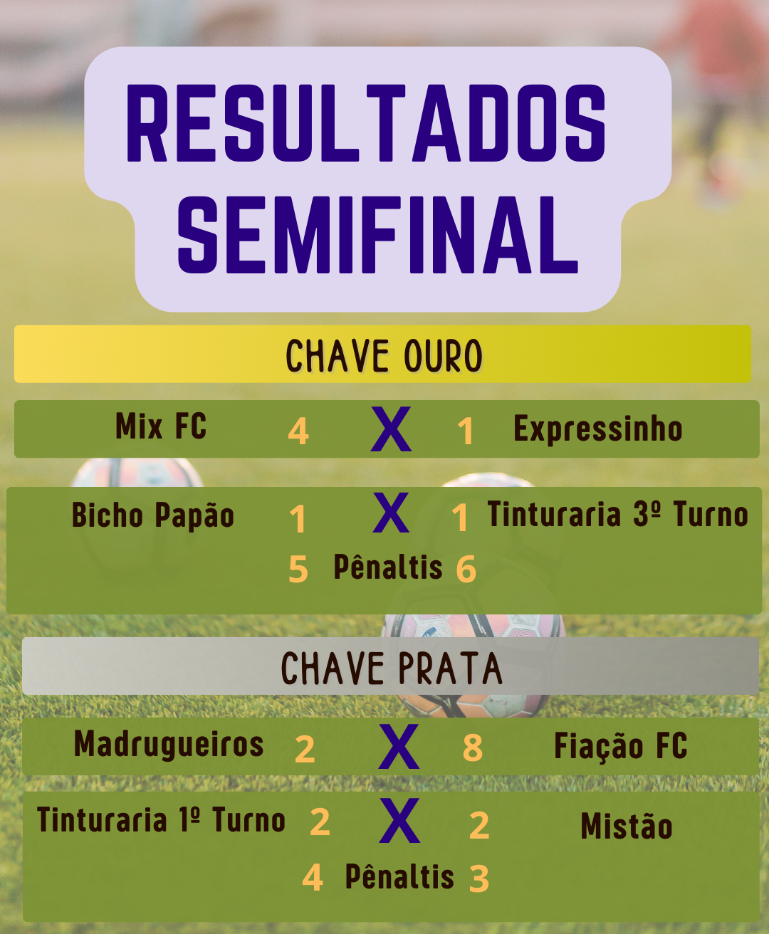 Recursos Humanos • jul 04 • 14:22 Torneio Interno de Futebol- Resultados Semifinal Clique e confira os resultados da SEMIFINAL do Torneiro Interno de Futebol. EXPRESSINHO MIX FC TINTURARIA 3º TURNO BICHO PAPÃO MISTÃO TINTURARIA 1º TURNO MADRUGUEIROS FIAÇÃO FC
