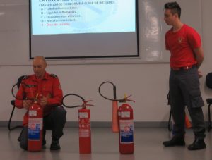Na ocasião, foram apresentados os tipos de extintores, suas classes e como manuseá-los. Bem como, demonstração do alarme visual, sonoro e tipos de acionamento existentes na empresa. Relembrando os colaboradores, o local do ponto de encontro quando precisar abandonar o posto de trabalho durante a ocorrência de um sinistro.
