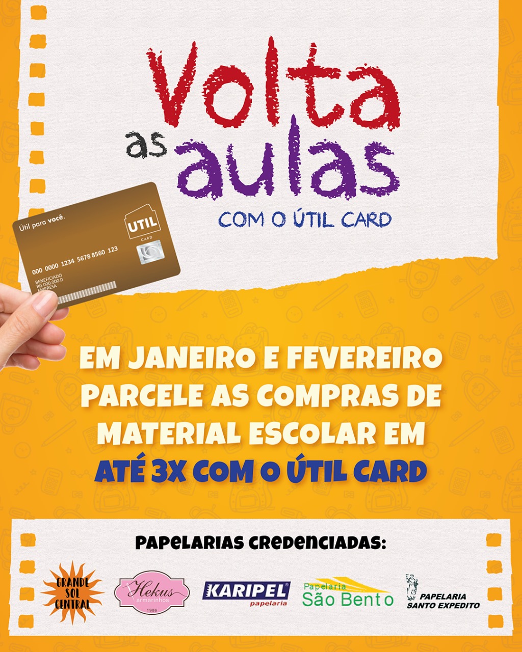 Recursos Humanos • jan 09 • 13:44 UTIL CARD liberado para compras de material escolar. Clique aqui e fique por dentro do período que você consegue parcelar o material escolar pelo cartão UTIL Card e papelarias conveniadas.